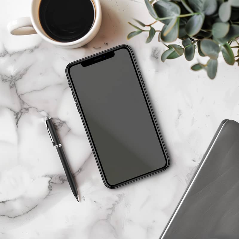 iPhone 17 Pro mockup, top-down desktop flat lay, sleek modern smartphone design, centered composition, minimalist workspace, notebook and pen placed neatly beside the phone, ceramic coffee cup, clean professional setup, neutral tones, realistic materials, ultra-realistic product mockup, soft professional studio lighting, subtle natural shadows, high contrast, sharp focus, luxury tech aesthetic, high resolution, commercial photography style
