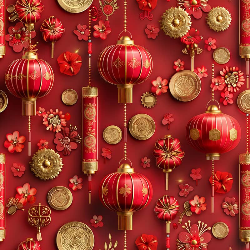 Chinese New Year poster pattern, photo-realistic festive design, repeating pattern of red lanterns, gold coins, firecrackers, cherry blossoms, and traditional Chinese symbols, rich red and gold color palette, intricate details, high resolution, elegant decorative texture, seamless repeating pattern, luxury festival aesthetic, professional poster-quality, studio lighting, sharp focus